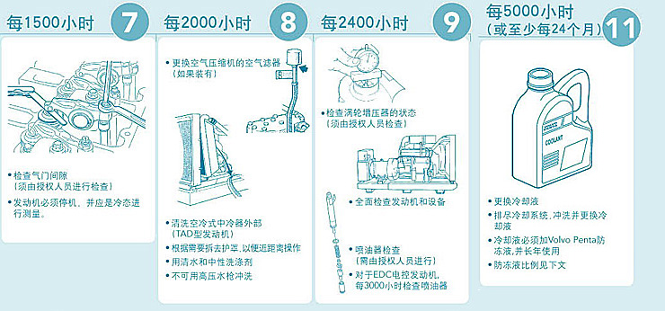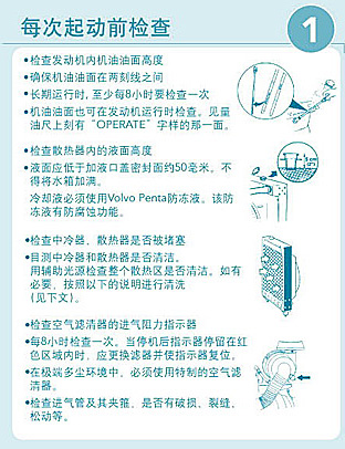 • 按照VOLVO PENTA簡易的保養規則,由VOLVO PENTA授權的服務代理商保養進行定期的保養服務(授權服務站必須在報修手冊中做好維修保養記錄,否則視為無效)。